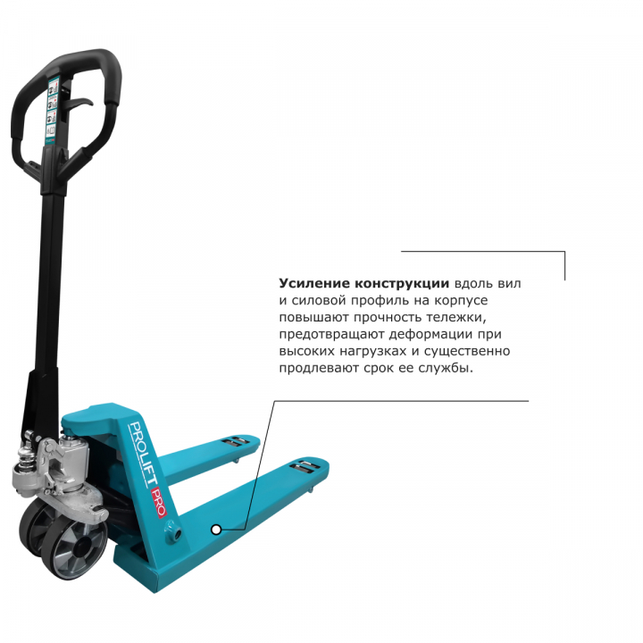 • Усиление конструкции вдоль вил и силовой профиль на корпусе повышают прочность тележки, предотвращают деформации при высоких нагрузках и существенно продлевают срок ее службы.